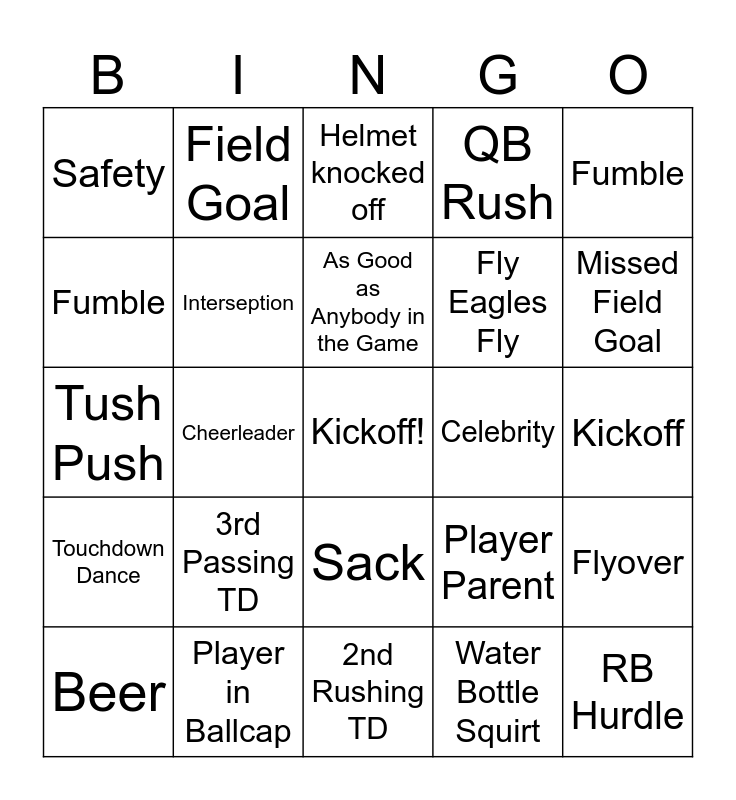 This bingo card has a free space and 35 words: Tush Push, Field Goal, Safety, Interseption, Sack, QB Rush, Fumble, Celebrity, As Good as Anybody in the Game, Interception, Tush Push, Fumble, QB Rush, Field Goal, Safety, Celebrity, Water Bottle Squirt, Cheerleader, Touchdown Dance, RB Hurdle, Player Parent, Beer, Flyover, Player in Ballcap, Helmet knocked off, Missed Field Goal, Water bath, Penalty Flag, Fly Eagles Fly, Kickoff, "As good as anyone in the game", 2nd Rushing TD, 3rd Passing TD, Field Goal and 4 Punts in Quarter.