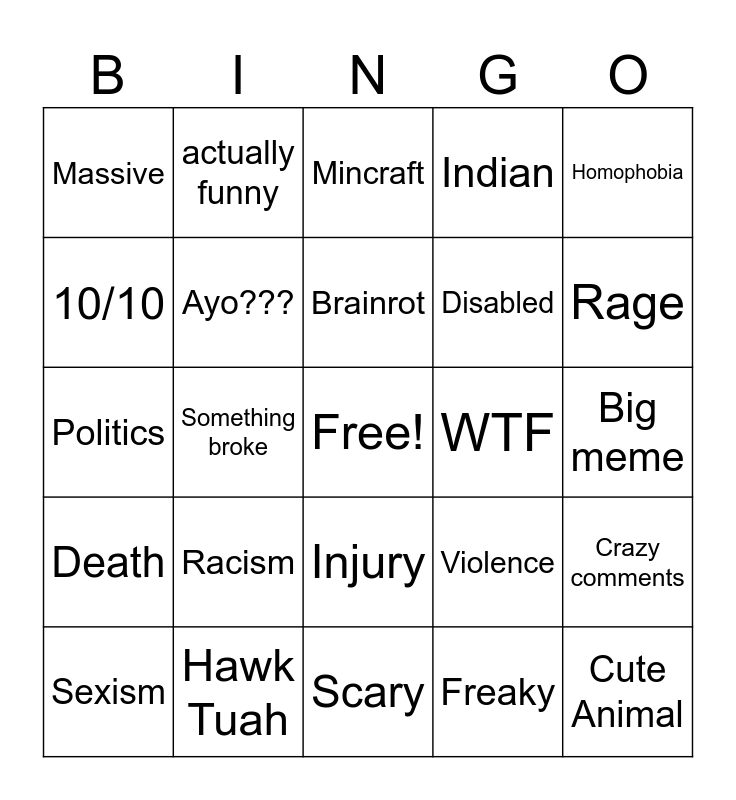 This bingo card has a free space and 24 words: Racism, Hawk Tuah, Brainrot, Sexism, Homophobia, Massive, 10/10, actually funny, WTF, Injury, Disabled, Politics, Violence, Crazy comments, Ayo???, Freaky, Big meme, Mincraft, Rage, Something broke, Cute Animal, Death, Indian and Scary.
