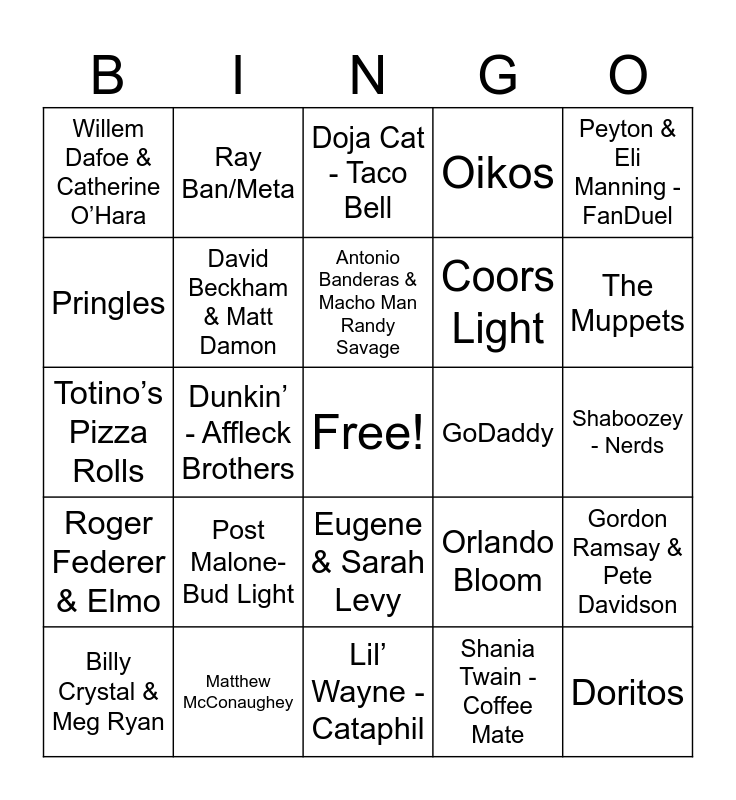 This bingo card has a free space and 24 words: Post Malone- Bud Light, Matthew McConaughey, Antonio Banderas & Macho Man Randy Savage, Billy Crystal & Meg Ryan, Peyton & Eli Manning - FanDuel, Willem Dafoe & Catherine O’Hara, Pringles, Ray Ban/Meta, GoDaddy, Eugene & Sarah Levy, Coors Light, Totino’s Pizza Rolls, Orlando Bloom, Gordon Ramsay & Pete Davidson, David Beckham & Matt Damon, Shania Twain - Coffee Mate, Shaboozey - Nerds, Doja Cat - Taco Bell, The Muppets, Dunkin’ - Affleck Brothers, Doritos, Roger Federer & Elmo, Oikos and Lil’ Wayne - Cataphil.