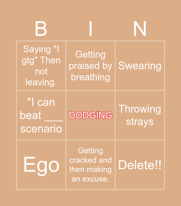 This bingo card has 9 words: Ego, Swearing, Getting praised by breathing, "I can beat ___ scenario, Saying "I gtg" Then not leaving., Throwing strays, DODGING, Delete!! and Getting cracked and then making an excuse..