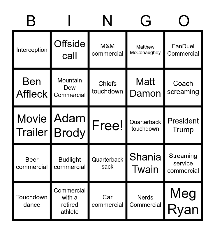 This bingo card has a free space and 34 words: Taylor Swift, Nerds Commercial, Booking.com commercial, Tie Game after 0-0-, Beer commercial, Mountain Dew Commercial, FanDuel Commercial, Touchdown dance, Offside call, Eagles touchdown, Chiefs touchdown, M&M commercial, Doritos Commercial, Face mask call, Quarterback touchdown, Coach screaming, Commercial with a retired athlete, Movie Trailer, Budlight commercial, Shania Twain, Quarterback sack, Incomplete pass, Interception, President Trump, Car commercial, Meg Ryan, Matthew McConaughey, Martha Stewart, Matt Damon, Ben Affleck, Vin Diesel, Adam Brody, Streaming service commercial and Statefarm commercial.