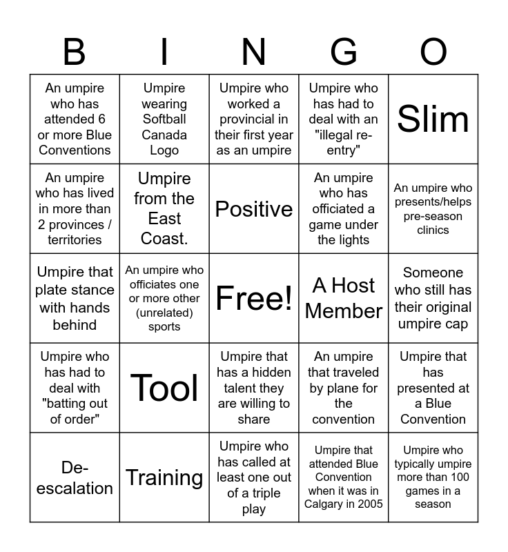 This bingo card has a free space and 24 words: Tool, Training, Positive, De-escalation, Slim, An umpire who has attended 6 or more Blue Conventions, An umpire who has lived in more than 2 provinces / territories, Umpire wearing Softball Canada Logo, A Host Member, Umpire that has a hidden talent they are willing to share, An umpire who has officiated a game under the lights, Umpire that plate stance with hands behind, An umpire that traveled by plane for the convention, Umpire that has presented at a Blue Convention, Umpire from the East Coast., Umpire that attended Blue Convention when it was in Calgary in 2005, Someone who still has their original umpire cap, Umpire who worked a provincial in their first year as an umpire, An umpire who presents/helps pre-season clinics, An umpire who officiates one or more other (unrelated) sports, Umpire who typically umpire more than 100 games in a season, Umpire who has had to deal with "batting out of order", Umpire who has had to deal with an "illegal re-entry" and Umpire who has called at least one out of a triple play.