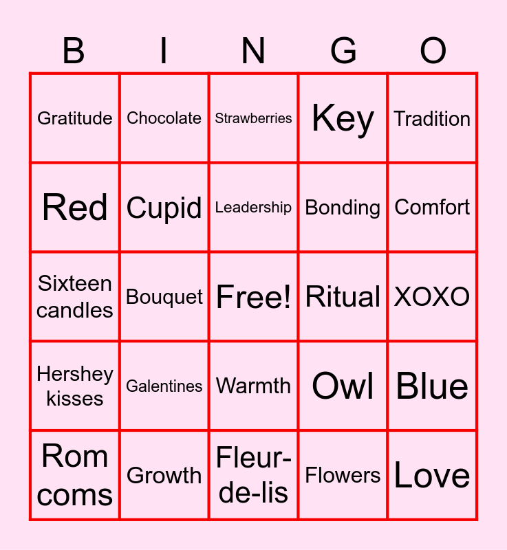 This bingo card has a free space and 50 words: Sisterhood, Love, Loyalty, Fleur-de-lis, Galentines, Friendship, Chocolate, Pink, Red, Laughter, Cupid, Key, Blue, Owl, Big, Little, Leadership, Ritual, Bond, Tradition, Bouquet, Flowers, Gratitude, Bonding, Sweet treats, Hearts, Comfort, Family, Strawberries, Warmth, Memories, Roses, Connection, Support, Growth, Genuine, Joy, Unity, Affection, XOXO, Teddy bears, Kisses, Cookies, February, Rom coms, Sixteen candles, Andie Anderson, A Cinderella Story, Hershey kisses and Bow and arrow.
