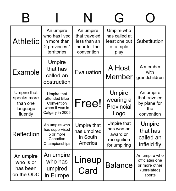 This bingo card has a free space and 24 words: An umpire who has supervised 5 or more Canadian Championships, An umpire who has umpired in Europe, Evaluation, An umpire who is or has been on the ODC, Substitution, Athletic, Example, An umpire who has lived in more than 2 provinces / territories, Umpire wearing a Provincial Logo, Umpire that has umpired in South America, A Host Member, Umpire that speaks more than one language fluently, Umpire that has won an award or recognition for umpiring, Umpire that has called an infield fly, Umpire that has called an obstruction, Balance, An umpire that traveled by plane for the convention, An umpire that traveled less than an hour for the convention, A member with grandchildren, Umpire that attended Blue Convention when it was in Calgary in 2005, An umpire who officiates one or more other (unrelated) sports, Reflection, Umpire who has called at least one out of a triple play and Lineup Card.