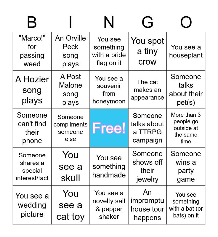 This bingo card has a free space and 24 words: You see a skull, You see a cat toy, You see a souvenir from honeymoon, You see a wedding picture, You see a houseplant, "Marco!" for passing weed, A Hozier song plays, An Orville Peck song plays, Someone talks about a TTRPG campaign, You see something handmade, The cat makes an appearance, Someone can't find their phone, Someone shows off their jewelry, Someone wins a party game, A Post Malone song plays, An impromptu house tour happens, More than 3 people go outside at the same time, You see something with a pride flag on it, Someone talks about their pet(s), Someone compliments someone else, You see something with a bat (or bats) on it, Someone shares a special interest/fact, You spot a tiny crow and You see a novelty salt & pepper shaker.