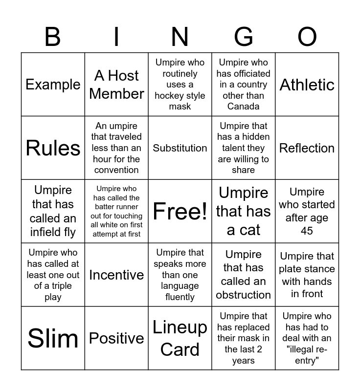 This bingo card has a free space and 24 words: Incentive, Positive, Substitution, Slim, Athletic, Example, Rules, A Host Member, Umpire that has a cat, Umpire that speaks more than one language fluently, Umpire that has a hidden talent they are willing to share, Umpire that has called an infield fly, Umpire that has called an obstruction, Umpire that plate stance with hands in front, An umpire that traveled less than an hour for the convention, Umpire that has replaced their mask in the last 2 years, Umpire who started after age 45, Umpire who routinely uses a hockey style mask, Reflection, Umpire who has called the batter runner out for touching all white on first attempt at first, Umpire who has had to deal with an "illegal re-entry", Umpire who has called at least one out of a triple play, Umpire who has officiated in a country other than Canada and Lineup Card.