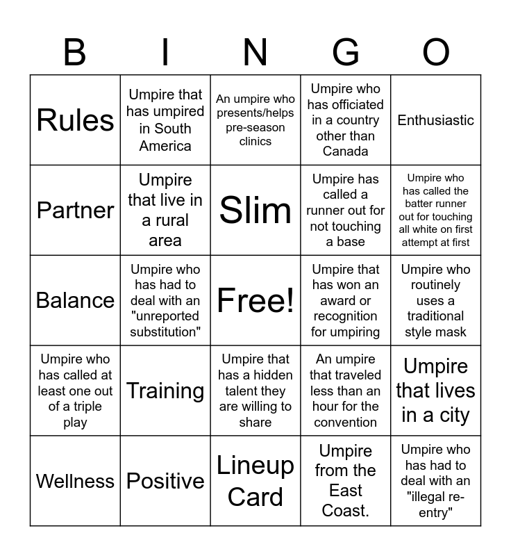This bingo card has a free space and 24 words: Training, Positive, Slim, Wellness, Enthusiastic, Rules, Partner, Umpire that has umpired in South America, Umpire that has won an award or recognition for umpiring, Umpire that has a hidden talent they are willing to share, Umpire has called a runner out for not touching a base, Balance, An umpire that traveled less than an hour for the convention, Umpire that lives in a city, Umpire that live in a rural area, Umpire from the East Coast., Umpire who routinely uses a traditional style mask, An umpire who presents/helps pre-season clinics, Umpire who has called the batter runner out for touching all white on first attempt at first, Umpire who has had to deal with an "unreported substitution", Umpire who has had to deal with an "illegal re-entry", Umpire who has called at least one out of a triple play, Umpire who has officiated in a country other than Canada and Lineup Card.