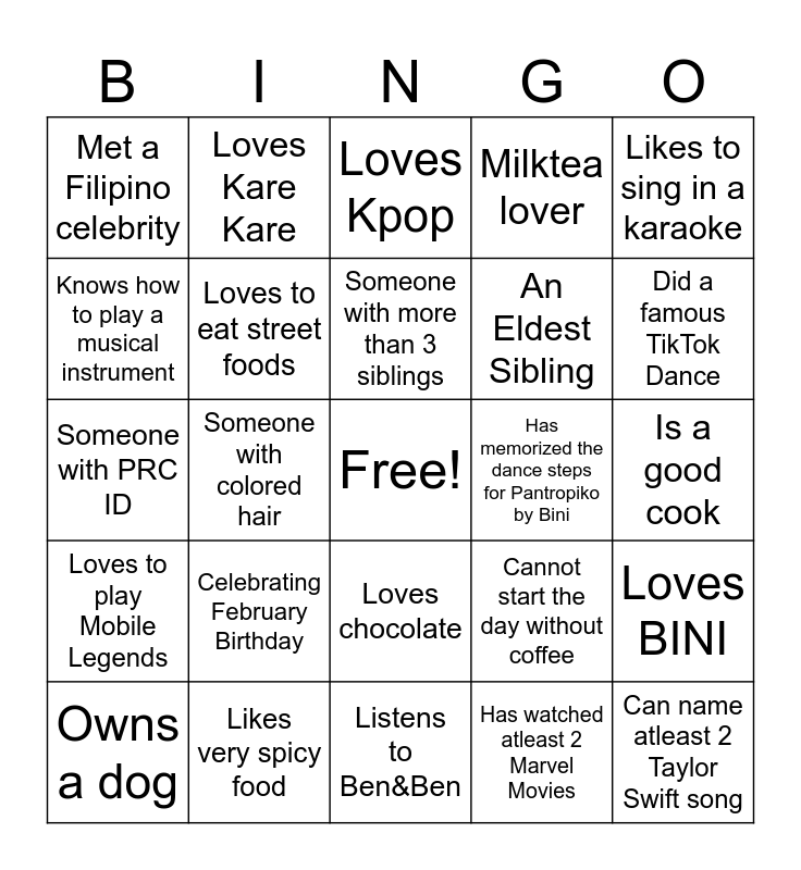 This bingo card has a free space and 24 words: Owns a dog, Celebrating February Birthday, Someone with more than 3 siblings, Has watched atleast 2 Marvel Movies, Likes to sing in a karaoke, Met a Filipino celebrity, Loves Kare Kare, Loves Kpop, Has memorized the dance steps for Pantropiko by Bini, Is a good cook, Someone with PRC ID, Loves to eat street foods, Cannot start the day without coffee, Loves BINI, Knows how to play a musical instrument, Likes very spicy food, Listens to Ben&Ben, Milktea lover, Did a famous TikTok Dance, Loves to play Mobile Legends, Someone with colored hair, Loves chocolate, An Eldest Sibling and Can name atleast 2 Taylor Swift song.