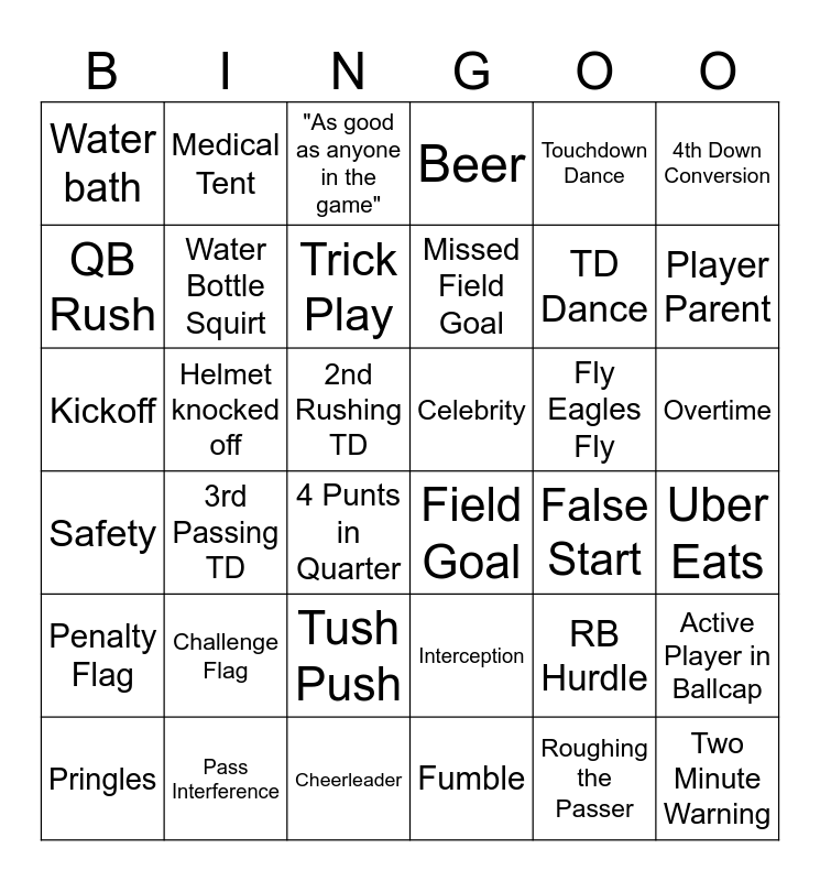 This bingo card has 36 words: Interception, Tush Push, Fumble, QB Rush, Safety, Celebrity, Water Bottle Squirt, Cheerleader, Touchdown Dance, RB Hurdle, Player Parent, Beer, Active Player in Ballcap, Helmet knocked off, Missed Field Goal, Water bath, Penalty Flag, Fly Eagles Fly, Kickoff, "As good as anyone in the game", 2nd Rushing TD, 3rd Passing TD, Field Goal, 4 Punts in Quarter, False Start, Medical Tent, TD Dance, Pass Interference, Trick Play, 4th Down Conversion, Two Minute Warning, Pringles, Uber Eats, Overtime, Challenge Flag and Roughing the Passer.