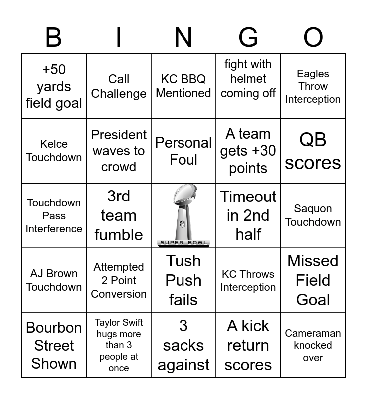This bingo card has a free space and 24 words: Attempted 2 Point Conversion, Taylor Swift hugs more than 3 people at once, Personal Foul, Bourbon Street Shown, Eagles Throw Interception, +50 yards field goal, Kelce Touchdown, Call Challenge, Timeout in 2nd half, Tush Push fails, A team gets +30 points, Touchdown Pass Interference, KC Throws Interception, Missed Field Goal, President waves to crowd, A kick return scores, Saquon Touchdown, KC BBQ Mentioned, QB scores, 3rd team fumble, Cameraman knocked over, AJ Brown Touchdown, fight with helmet coming off and 3 sacks against.