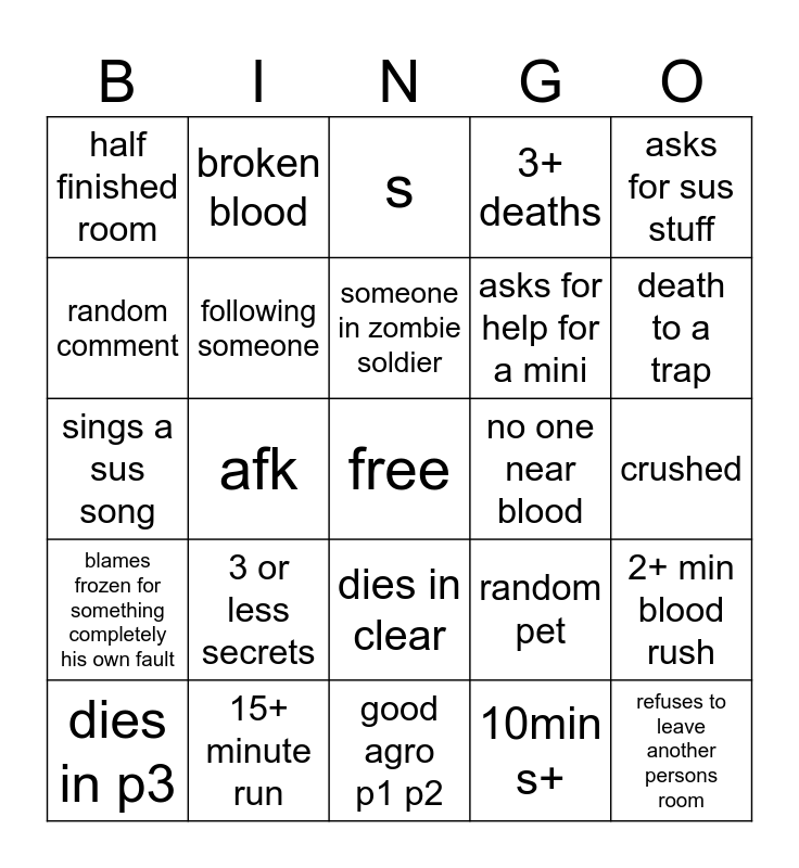 This bingo card has a free space and 24 words: 3 or less secrets, 15+ minute run, someone in zombie soldier, dies in p3, asks for sus stuff, half finished room, random comment, broken blood, no one near blood, dies in clear, asks for help for a mini, sings a sus song, random pet, 2+ min blood rush, following someone, 10min s+, crushed, s, death to a trap, afk, refuses to leave another persons room, blames frozen for something completely his own fault, 3+ deaths and good agro p1 p2.