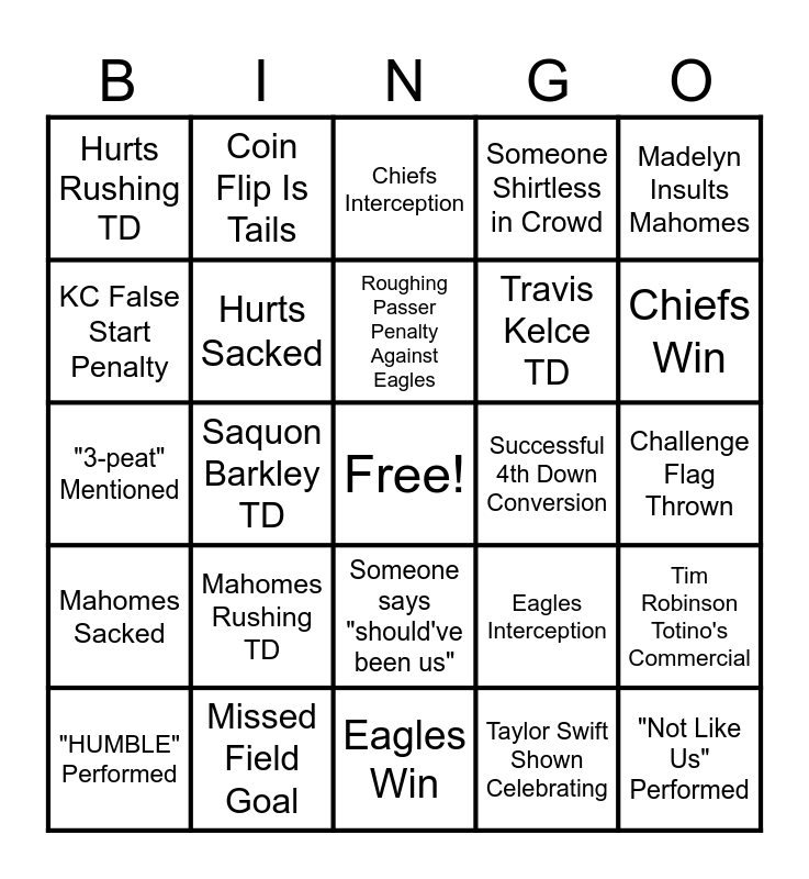 This bingo card has a free space and 24 words: Mahomes Rushing TD, Missed Field Goal, Roughing Passer Penalty Against Eagles, "HUMBLE" Performed, Madelyn Insults Mahomes, Hurts Rushing TD, KC False Start Penalty, Coin Flip Is Tails, Successful 4th Down Conversion, Someone says "should've been us", Travis Kelce TD, "3-peat" Mentioned, Eagles Interception, Tim Robinson Totino's Commercial, Hurts Sacked, Taylor Swift Shown Celebrating, Challenge Flag Thrown, Chiefs Interception, Chiefs Win, Saquon Barkley TD, "Not Like Us" Performed, Mahomes Sacked, Someone Shirtless in Crowd and Eagles Win.