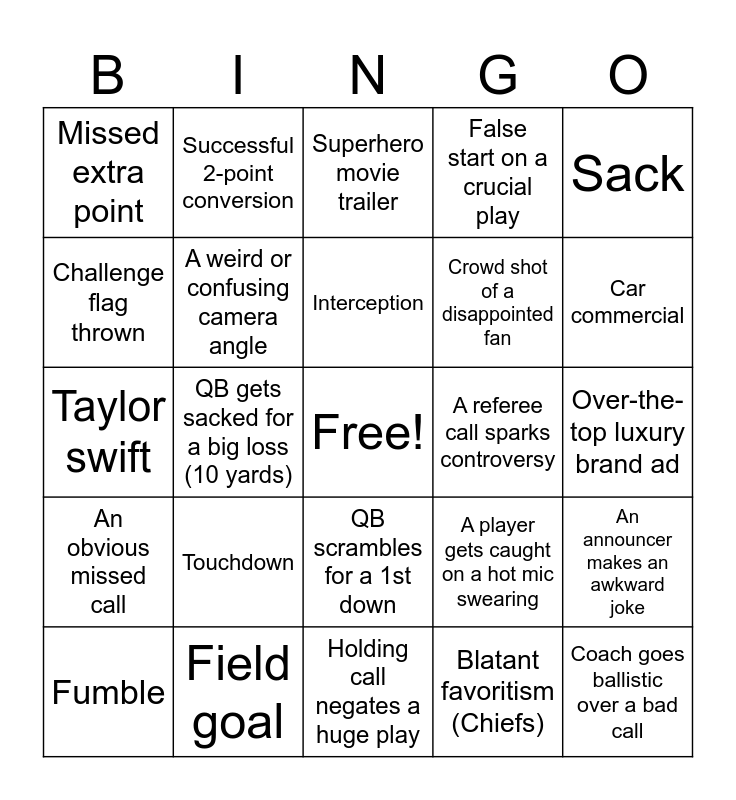 This bingo card has a free space and 24 words: Touchdown, Field goal, Interception, Fumble, Sack, Missed extra point, Challenge flag thrown, Successful 2-point conversion, A referee call sparks controversy, QB scrambles for a 1st down, Crowd shot of a disappointed fan, Taylor swift, A player gets caught on a hot mic swearing, An announcer makes an awkward joke, A weird or confusing camera angle, Blatant favoritism (Chiefs), Over-the-top luxury brand ad, Superhero movie trailer, Car commercial, QB gets sacked for a big loss (10 yards), Coach goes ballistic over a bad call, An obvious missed call, False start on a crucial play and Holding call negates a huge play.