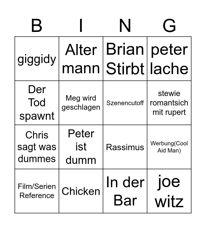 This bingo card has 16 words: Chicken, Werbung(Cool Aid Man), Brian Stirbt, giggidy, Chris sagt was dummes, Alter mann, Rassimus, In der Bar, Der Tod spawnt, Meg wird geschlagen, Film/Serien Reference, peter lache, Peter ist dumm, stewie romantsich mit rupert, Szenencutoff and joe witz.