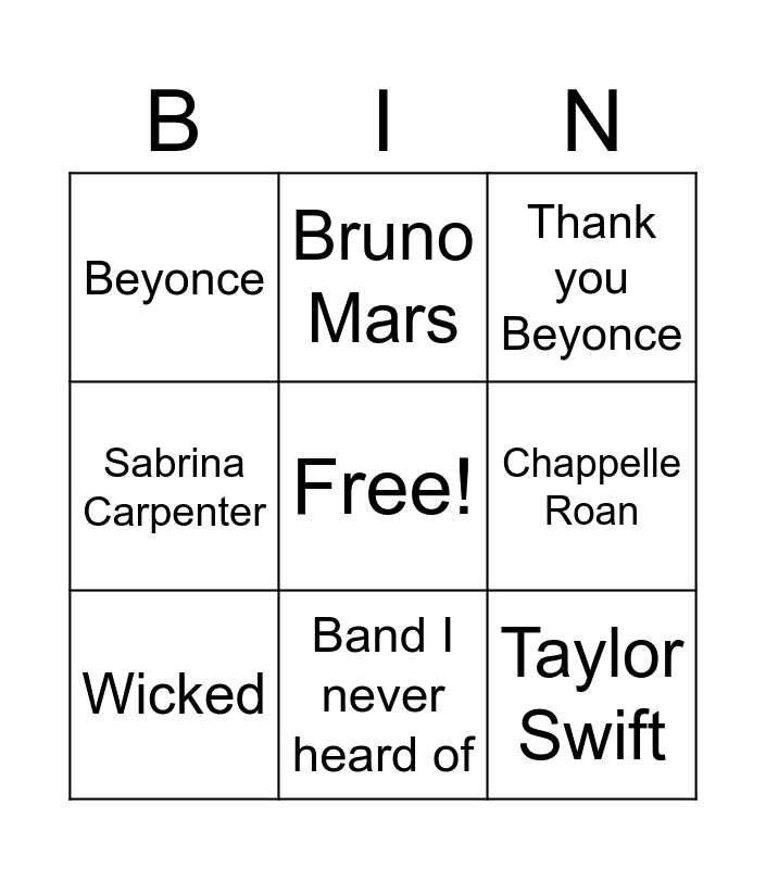 This bingo card has a free space and 8 words: Chappelle Roan, Thank you Beyonce, Bruno Mars, Wicked, Beyonce, Taylor Swift, Sabrina Carpenter and Band I never heard of.