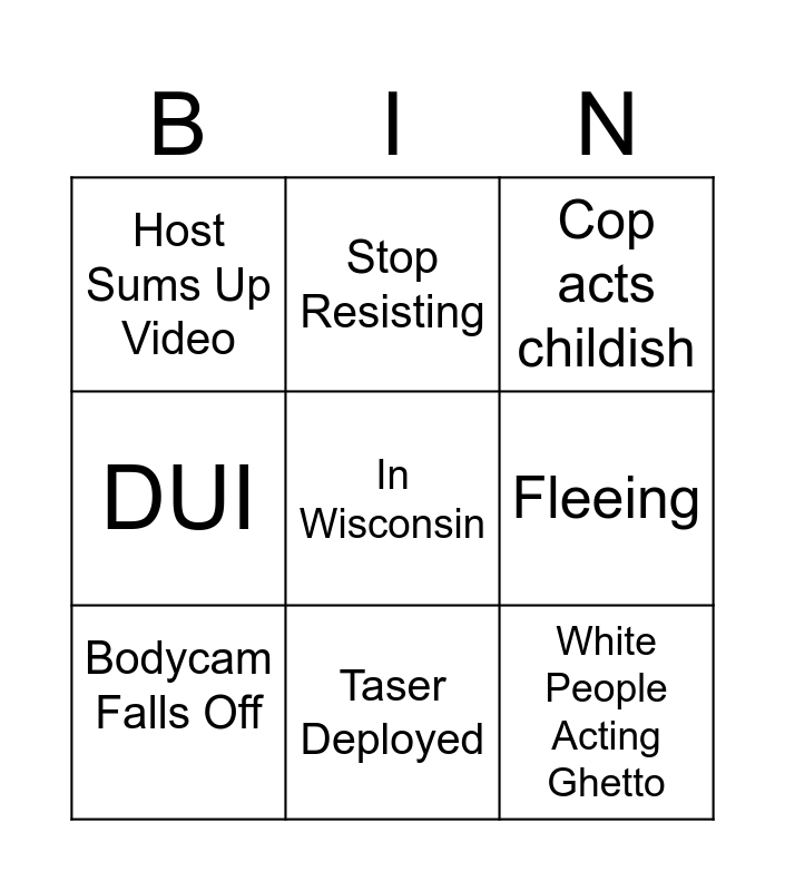 This bingo card has 9 words: Bodycam Falls Off, In Wisconsin, Cop acts childish, Host Sums Up Video, Stop Resisting, Fleeing, DUI, Taser Deployed and White People Acting Ghetto.