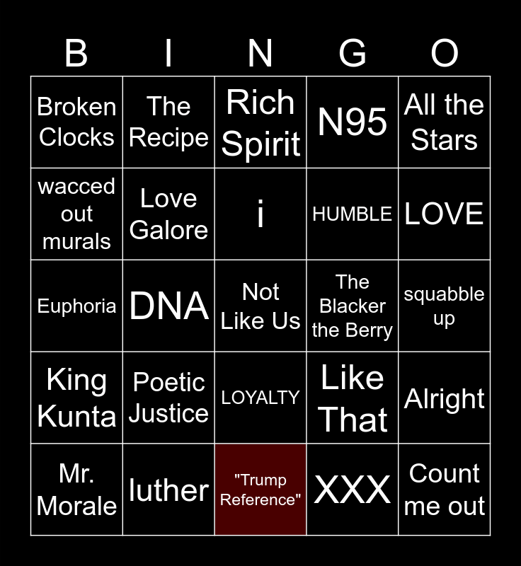This bingo card has a free space and 24 words: Poetic Justice, luther, i, Mr. Morale, All the Stars, Broken Clocks, wacced out murals, The Recipe, The Blacker the Berry, LOYALTY, HUMBLE, Euphoria, Like That, Alright, Love Galore, XXX, squabble up, Rich Spirit, LOVE, DNA, Count me out, King Kunta, N95 and "Trump Reference".