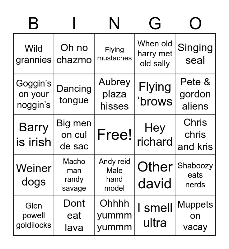 This bingo card has a free space and 25 words: Macho man randy savage, Ohhhh yummm yummm, Aubrey plaza hisses, Glen powell goldilocks, Singing seal, Wild grannies, Goggin’s on your noggin’s, Oh no chazmo, Hey richard, Andy reid Male hand model, Flying ‘brows, Barry is irish, Other david, Shaboozy eats nerds, Dancing tongue, Vin diesel eats ice cream, Chris chris and kris, Flying mustaches, Pete & gordon aliens, Big men on cul de sac, Muppets on vacay, Dont eat lava, Weiner dogs, When old harry met old sally and I smell ultra.