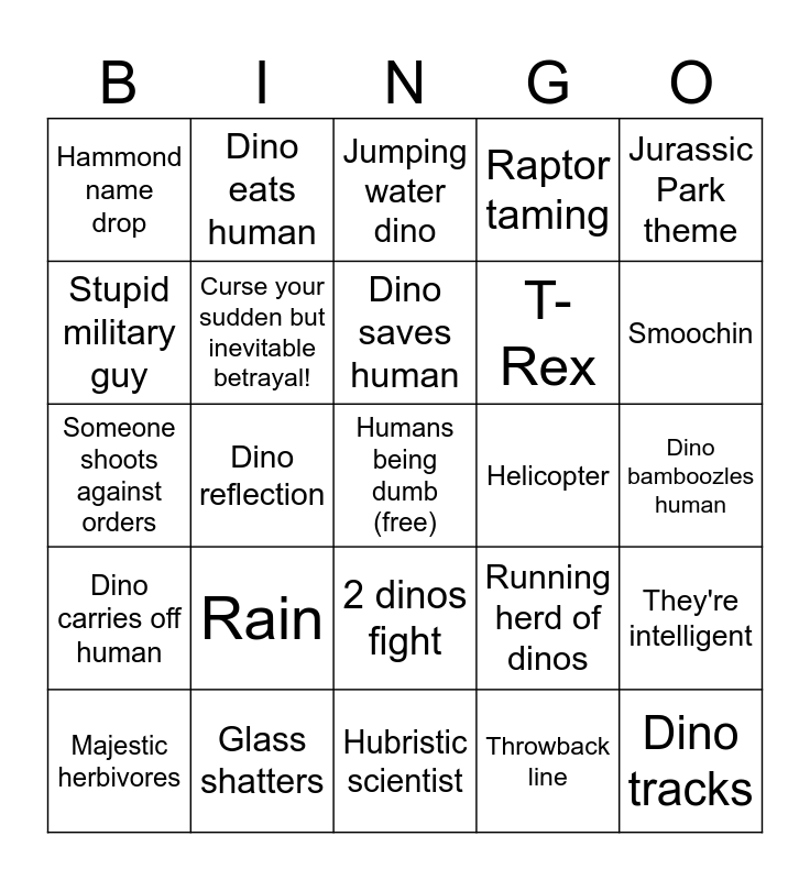 This bingo card has a free space and 24 words: Rain, Glass shatters, Dino saves human, Majestic herbivores, Jurassic Park theme, Hammond name drop, Stupid military guy, Dino eats human, Helicopter, 2 dinos fight, T-Rex, Someone shoots against orders, Running herd of dinos, They're intelligent, Curse your sudden but inevitable betrayal!, Throwback line, Dino bamboozles human, Jumping water dino, Smoochin, Dino reflection, Dino tracks, Dino carries off human, Raptor taming and Hubristic scientist.