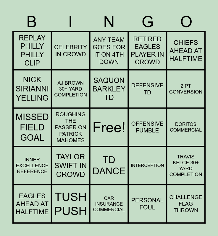 This bingo card has a free space and 24 words: TAYLOR SWIFT IN CROWD, TUSH PUSH, SAQUON BARKLEY TD, EAGLES AHEAD AT HALFTIME, CHIEFS AHEAD AT HALFTIME, REPLAY PHILLY PHILLY CLIP, NICK SIRIANNI YELLING, CELEBRITY IN CROWD, OFFENSIVE FUMBLE, TD DANCE, DEFENSIVE TD, MISSED FIELD GOAL, INTERCEPTION, TRAVIS KELCE 30+ YARD COMPLETION, AJ BROWN 30+ YARD COMPLETION, PERSONAL FOUL, DORITOS COMMERCIAL, ANY TEAM GOES FOR IT ON 4TH DOWN, 2 PT CONVERSION, ROUGHING THE PASSER ON PATRICK MAHOMES, CHALLENGE FLAG THROWN, INNER EXCELLENCE REFERENCE, RETIRED EAGLES PLAYER IN CROWD and CAR INSURANCE COMMERCIAL.