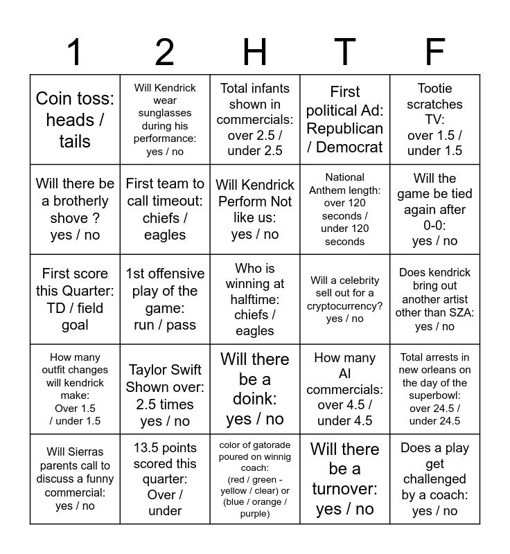 This bingo card has a free space and 24 words: Taylor Swift Shown over: 2.5 times yes / no, 13.5 points scored this quarter: Over / under, Will Kendrick Perform Not like us: yes / no, Will Sierras parents call to discuss a funny commercial: yes / no, Tootie scratches TV: over 1.5 / under 1.5, Coin toss: heads / tails, Will there be a brotherly shove ? yes / no, Will Kendrick wear sunglasses during his performance: yes / no, Will a celebrity sell out for a cryptocurrency? yes / no, Will there be a doink: yes / no, National Anthem length: over 120 seconds / under 120 seconds, First score this Quarter: TD / field goal, How many AI commercials: over 4.5 / under 4.5, Total arrests in new orleans on the day of the superbowl: over 24.5 / under 24.5, First team to call timeout: chiefs / eagles, Will there be a turnover: yes / no, Does kendrick bring out another artist other than SZA: yes / no, Total infants shown in commercials: over 2.5 / under 2.5, Will the game be tied again after 0-0: yes / no, 1st offensive play of the game: run / pass, Does a play get challenged by a coach: yes / no, How many outfit changes will kendrick make: Over 1.5 / under 1.5, First political Ad: Republican / Democrat and color of gatorade poured on winnig coach: (red / green - yellow / clear) or (blue / orange / purple).