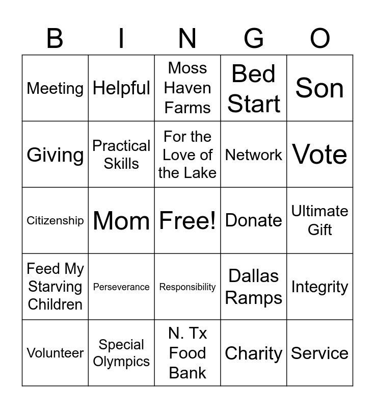 This bingo card has a free space and 27 words: Dallas Ramps, Respect, Network, N. Tx Food Bank, Giving, Moss Haven Farms, Helpful, Feed My Starving Children, Donate, Integrity, Citizenship, Bed Start, Volunteer, Special Olympics, Vote, Fellowship, Practical Skills, For the Love of the Lake, Perseverance, Meeting, Ultimate Gift, Charity, Mom, Service, Responsibility, Son and Philanthropy.
