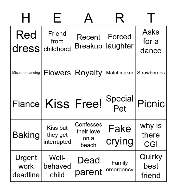 This bingo card has a free space and 84 words: Diner, Bakery, Recent Breakup, Farm, Coffee Shop, Apology, Following a Dream, Small town, Hug, Pond, Lake, Chocolates, Flowers, Special Pet, Big City, Red dress, Urgent work deadline, Misunderstanding, Owner of a cute small business, Talk about first love, Marriage proposal, Matchmaker, Quirky best friend, Former love makes an appearance, Kiss, "Accidental" fall, "I don't believe in Valentine's day", "I don't believe in romance", Gets lost, A contest of some sort, Kiss but they get interrupted, Overbearing mother, Fake date, Fiance, Accidentally breaks something, Uncomfortable eye contact, Dead parent, Dead ex-spouse, Strawberries, Baking, Enemies to lovers, Sipping wine or cocktail, Terrible writing, Red flag that is swiftly ignored, "It's complicated", Friend from high school, Friend from childhood, Wise magical grandma, "We're having a baby!", Kiss under gazebo, Raining, Fake crying, Forced laughter, Valentine, "We're just friends", Trying on different outfits montage, Well-behaved child, Royalty, Boat ride, Picnic, Love triangle, *Cringe*, Festival, Marriage scene, Business Rivalry, Financial troubles, False accusations, Mean mother/mother-in-law, Asks for a dance, *flexes muscles*, why is there CGI, Awkward second run in, Actress has a weird name, Actor has a weird name, Confesses their love on a beach, Family emergency, Character with a valentine's themed name, Guy fixes something for girl, Quits job to be with family, girlie needs voice lessons, world's worst pop song, Character is actually royalty, pending real estate deal and *REALLY JARRING FLASHBACK*.