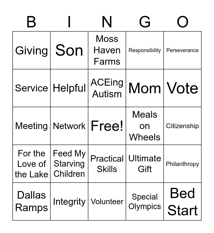 This bingo card has a free space and 29 words: Dallas Ramps, Respect, Network, Buddy Up for Life, Giving, Moss Haven Farms, Helpful, Feed My Starving Children, Meals on Wheels, Integrity, Citizenship, Bed Start, Volunteer, Special Olympics, Vote, Fellowship, Practical Skills, For the Love of the Lake, Perseverance, Meeting, Ultimate Gift, Charity, Mom, Service, Responsibility, Son, Philanthropy, ACEing Autism and Buckner Shoes for Orphan Souls.