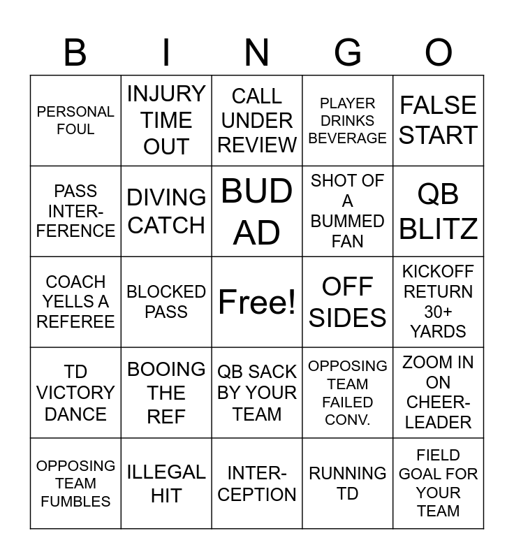This bingo card has a free space and 24 words: BOOING THE REF, ILLEGAL HIT, BUD AD, OPPOSING TEAM FUMBLES, FALSE START, PERSONAL FOUL, PASS INTER- FERENCE, INJURY TIME OUT, OFF SIDES, QB SACK BY YOUR TEAM, SHOT OF A BUMMED FAN, COACH YELLS A REFEREE, OPPOSING TEAM FAILED CONV., ZOOM IN ON CHEER- LEADER, DIVING CATCH, RUNNING TD, KICKOFF RETURN 30+ YARDS, CALL UNDER REVIEW, QB BLITZ, BLOCKED PASS, FIELD GOAL FOR YOUR TEAM, TD VICTORY DANCE, PLAYER DRINKS BEVERAGE and INTER-CEPTION.