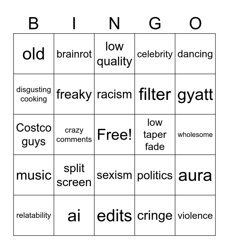 This bingo card has a free space and 24 words: split screen, ai, racism, relatability, dancing, old, disgusting cooking, brainrot, low taper fade, sexism, filter, Costco guys, politics, aura, freaky, cringe, wholesome, low quality, gyatt, crazy comments, violence, music, celebrity and edits.