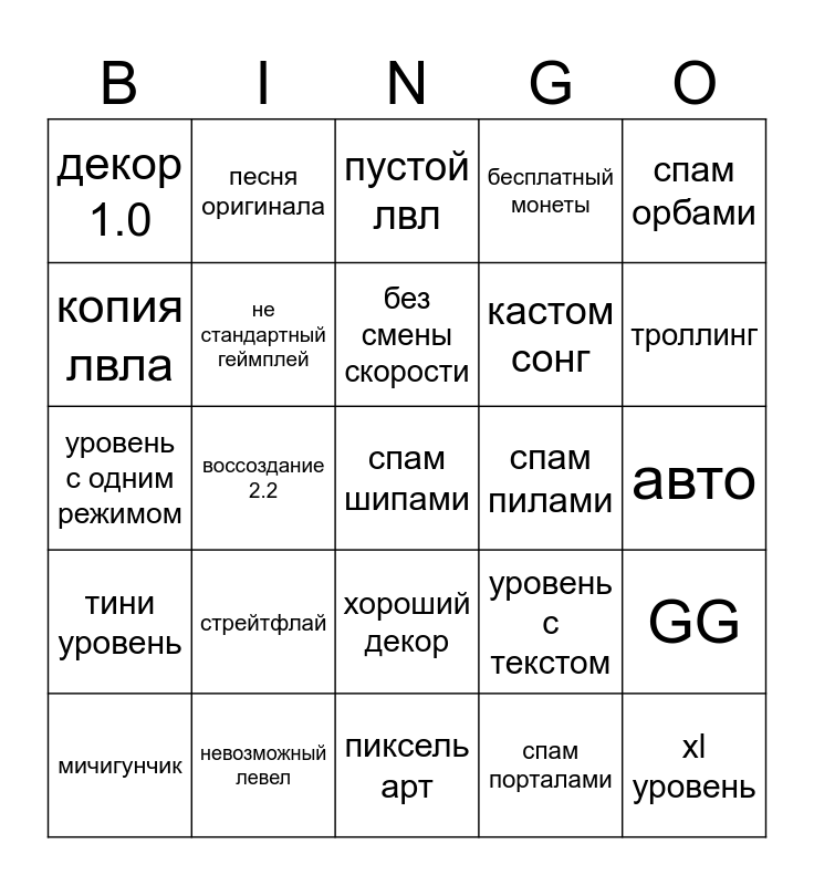 This bingo card has a free space and 24 words: стрейтфлай, невозможный левел, без смены скорости, мичигунчик, спам орбами, декор 1.0, копия лвла, песня оригинала, спам пилами, хороший декор, кастом сонг, уровень с одним режимом, уровень с текстом, GG, не стандартный геймплей, спам порталами, авто, пустой лвл, троллинг, воссоздание 2.2, xl уровень, тини уровень, бесплатный монеты and пиксель арт.