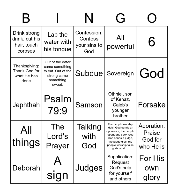 This bingo card has a free space and 24 words: The Lord's Prayer, A sign, Subdue, Deborah, 6, Drink strong drink, cut his hair, touch corpses, Thanksgiving: Thank God for what He has done, Lap the water with his tongue, Othniel, son of Kenaz, Caleb's younger brother, Talking with God, Sovereign, Jephthah, The people worship idols, God sends an oppressor, the people repent and seek God, God sends a judge, the judge dies, the people worship false gods again..., Adoration: Praise God for who He is, Out of the eater came something to eat. Out of the strong came something sweet., Supplication: Request God's help for yourself and others, Forsake, Confession: Confess your sins to God, God, Psalm 79:9, For His own glory, All things, All powerful and Judges.