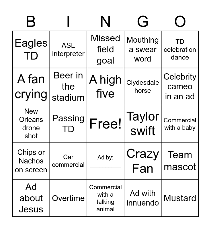 This bingo card has a free space and 30 words: Overtime, Rushing TD, Passing TD, Chiefs TD, Eagles TD, Missed field goal, Beer in the stadium, Ad by: __________, Taylor swift, Commercial with a talking animal, Commercial with a baby, Mustard, Ad with innuendo, Pharma Commercial, Celebrity cameo in an ad, Tech company Ad, Crazy Fan, Chips or Nachos on screen, Car commercial, TD celebration dance, New Orleans drone shot, Abbott Elementary / IASIP, ASL interpreter, Clydesdale horse, A fan crying, Mouthing a swear word, Team mascot, Ad about Jesus, A high five and Coin Toss: __________.