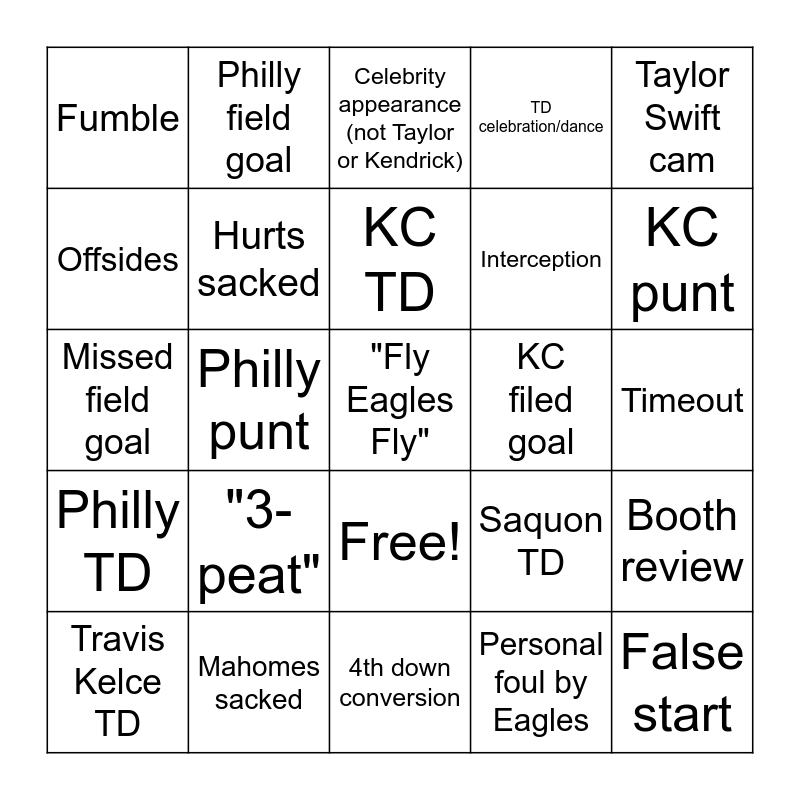 This bingo card has 26 words: Free!, Personal foul by Eagles, KC TD, Mahomes sacked, Taylor Swift cam, Fumble, Offsides, Philly field goal, Timeout, Saquon TD, Interception, Missed field goal, Booth review, Travis Kelce TD, Philly punt, 20+ yard play, TD celebration/dance, Philly TD, Celebrity appearance (not Taylor or Kendrick), "Fly Eagles Fly", KC punt, 4th down conversion, KC filed goal, "3-peat", Hurts sacked and False start.