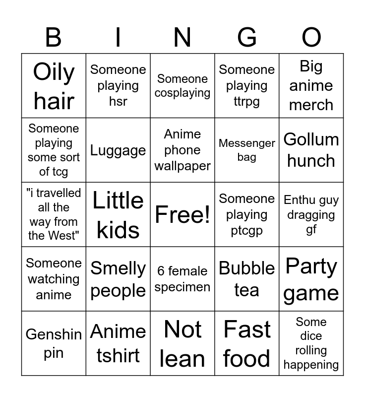 This bingo card has a free space and 24 words: Smelly people, Anime tshirt, Anime phone wallpaper, Genshin pin, Big anime merch, Oily hair, Someone playing some sort of tcg, Someone playing hsr, Someone playing ptcgp, 6 female specimen, Messenger bag, "i travelled all the way from the West", Bubble tea, Party game, Luggage, Fast food, Enthu guy dragging gf, Someone cosplaying, Gollum hunch, Little kids, Some dice rolling happening, Someone watching anime, Someone playing ttrpg and Not lean.