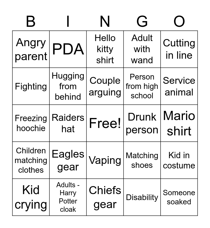 This bingo card has a free space and 24 words: Eagles gear, Adults -Harry Potter cloak, Couple arguing, Kid crying, Cutting in line, Angry parent, Fighting, PDA, Drunk person, Vaping, Person from high school, Freezing hoochie, Matching shoes, Kid in costume, Hugging from behind, Disability, Mario shirt, Hello kitty shirt, Service animal, Raiders hat, Someone soaked, Children matching clothes, Adult with wand and Chiefs gear.