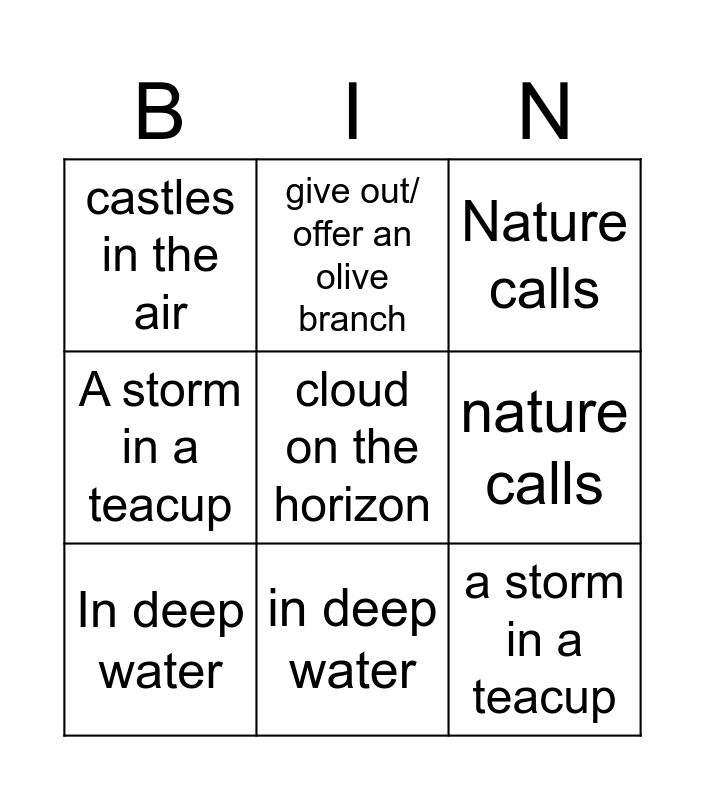 This bingo card has 24 words: a breath of fresh air, always chasing rainbows, in deep water, bed of roses, cloud on the horizon, castles in the air, nature calls, give out/ offer an olive branch, can't see the forest/wood for the trees, rain on someone's parade, a storm in a teacup, climate of opinion, A breath of fresh air, Always chasing rainbows, In deep water, Bed of roses, Castles in the air, Nature calls, Hold out/offer an olive branch, Can’t see the forest/wood for the trees, Cloud on the horizon, Rain on someone’s parade, A storm in a teacup and Climate of opinion.