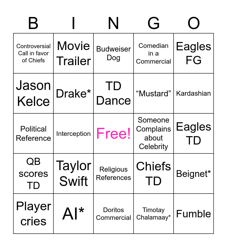 This bingo card has a free space and 24 words: Taylor Swift, AI*, TD Dance, Player cries, Eagles FG, Controversial Call in favor of Chiefs, Jason Kelce, Movie Trailer, Someone Complains about Celebrity, Religious References, “Mustard”, Political Reference, Chiefs TD, Beignet*, Drake*, Timotay Chalamaay*, Eagles TD, Budweiser Dog, Kardashian, Interception, Fumble, QB scores TD, Comedian in a Commercial and Doritos Commercial.