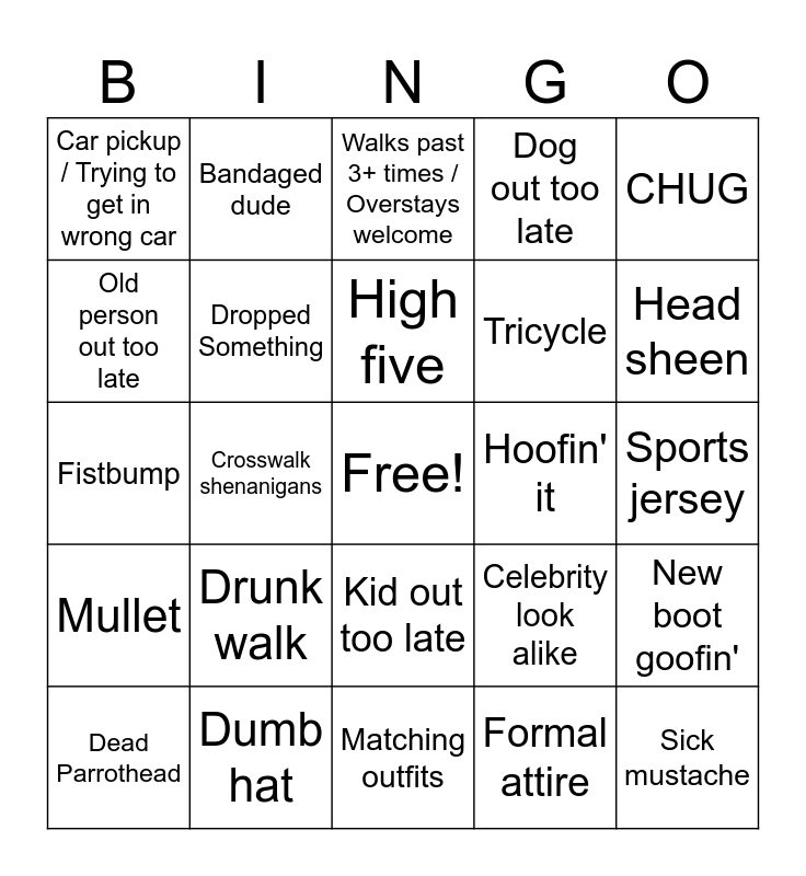 This bingo card has a free space and 35 words: Acknowledge Camera, Jeans & Flip Flops, Cowboy Attire, Dropped Something, Kid out too late, Dog out too late, Old person out too late, Nose pick / Wedgie pull / Crotch grab / Spit, High five, Handshake, Fistbump, CHUG, Key West vehicle (Ghost Tour Bus, Pink Taxi), Dancing / Twerking, Car pickup / Trying to get in wrong car, Hoofin' it, Formal attire, Crosswalk shenanigans, Mullet, Sick mustache, Celebrity look alike, Dead Parrothead, New boot goofin', Dumb hat, Walks past 3+ times / Overstays welcome, Head sheen, Dickhead truck or car (underglow counts), American flag clothing, Tricycle, Sports jersey, Bachelor/Bachelorette party, Matching outfits, Drunk walk, Bandaged dude and Cop car / Ambulance / Fire truck / Emergency vehicle.