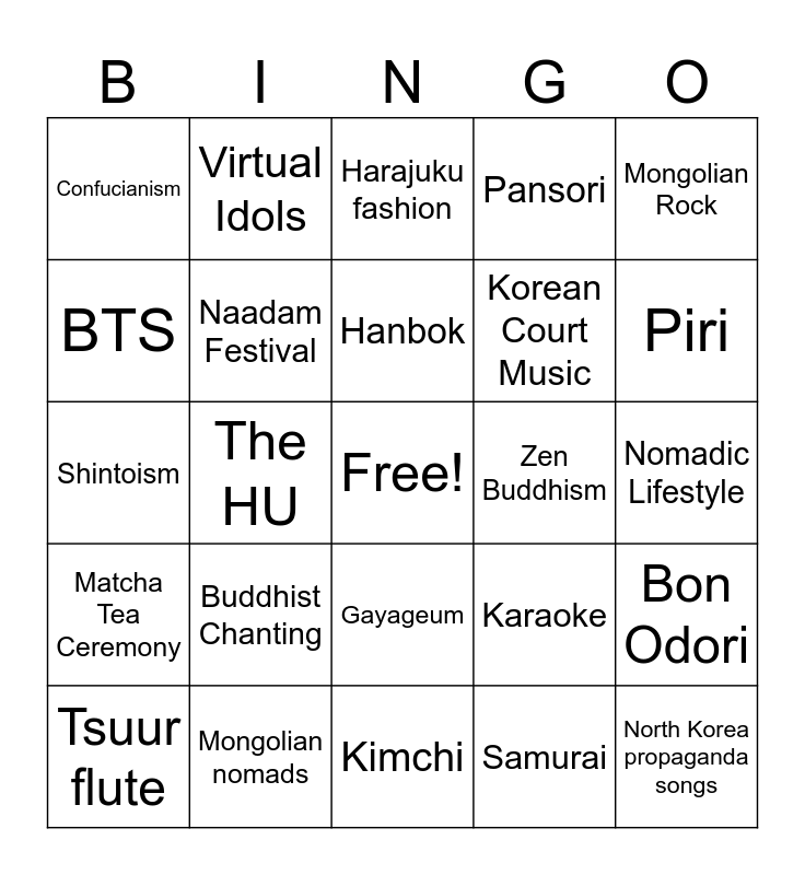 This bingo card has a free space and 35 words: Genghis Khan, K-pop, Throat singing, Naadam Festival, Gayageum, Pansori, BTS, Anime & Manga, Hanbok, Kim Jong-un, Shintoism, Mongolian Rock, Taiko Drums, Fan Dance, Confucianism, Zen Buddhism, Samurai, The HU, Matcha Tea Ceremony, North Korea propaganda songs, Karaoke, Tsuur flute, Bon Odori, Mongolian nomads, Harajuku fashion, Piri, Gagaku, Yurts, Korean Court Music, Nomadic Lifestyle, Tsagaan Sar, Kimchi, Buddhist Chanting, Virtual Idols and Confucian Values.
