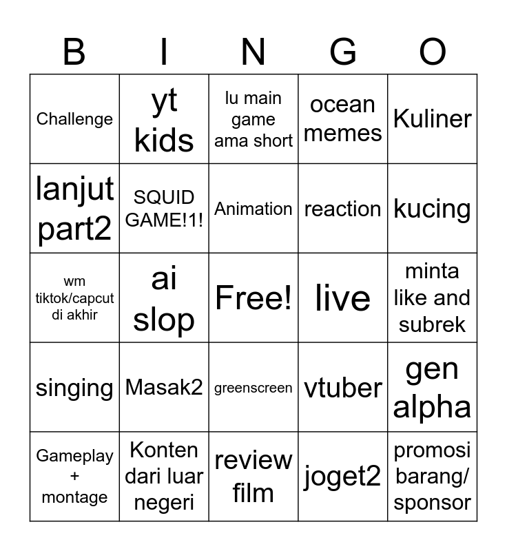 This bingo card has a free space and 24 words: Masak2, Konten dari luar negeri, Animation, Gameplay + montage, Kuliner, Challenge, lanjut part2, yt kids, live, greenscreen, reaction, wm tiktok/capcut di akhir, vtuber, gen alpha, SQUID GAME!1!, joget2, minta like and subrek, lu main game ama short, kucing, ai slop, promosi barang/ sponsor, singing, ocean memes and review film.
