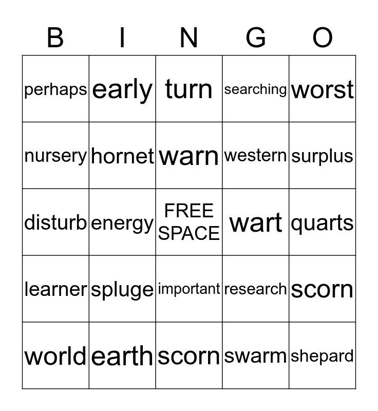 This bingo card has a free space and 24 words: spluge, earth, warn, world, worst, perhaps, nursery, early, wart, important, western, disturb, research, scorn, hornet, swarm, quarts, turn, surplus, energy, shepard, learner, searching and scorn.