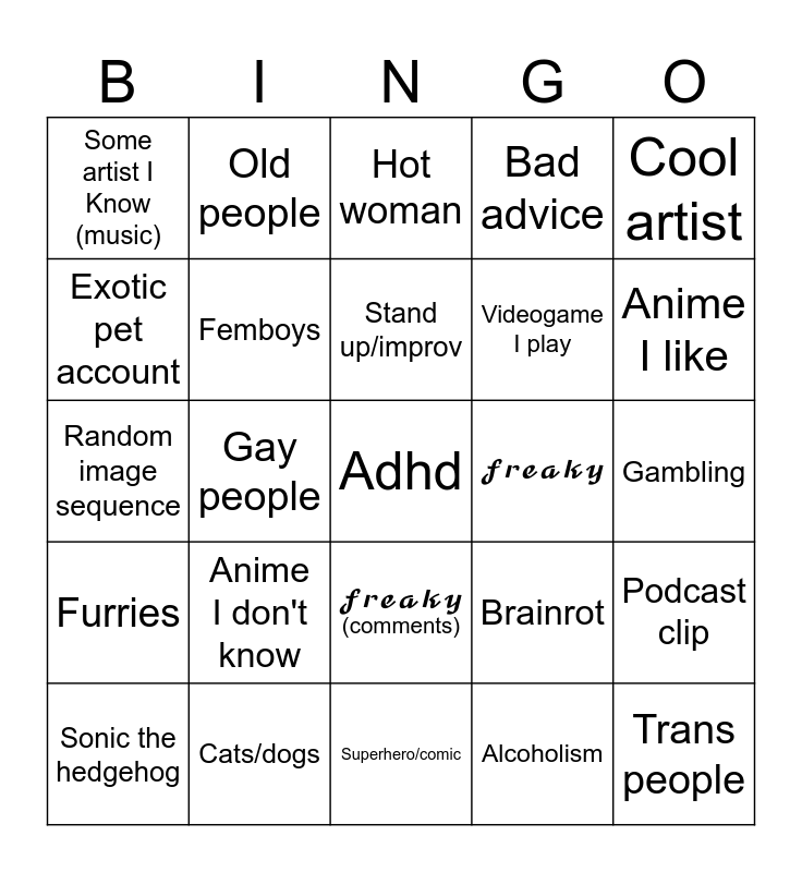 This bingo card has a free space and 24 words: Anime I don't know, Cats/dogs, Stand up/improv, Sonic the hedgehog, Cool artist, Some artist I Know (music), Exotic pet account, Old people, 𝓯𝓻𝓮𝓪𝓴𝔂, 𝓯𝓻𝓮𝓪𝓴𝔂 (comments), Videogame I play, Random image sequence, Brainrot, Podcast clip, Femboys, Alcoholism, Gambling, Hot woman, Anime I like, Gay people, Trans people, Furries, Bad advice and Superhero/comic.