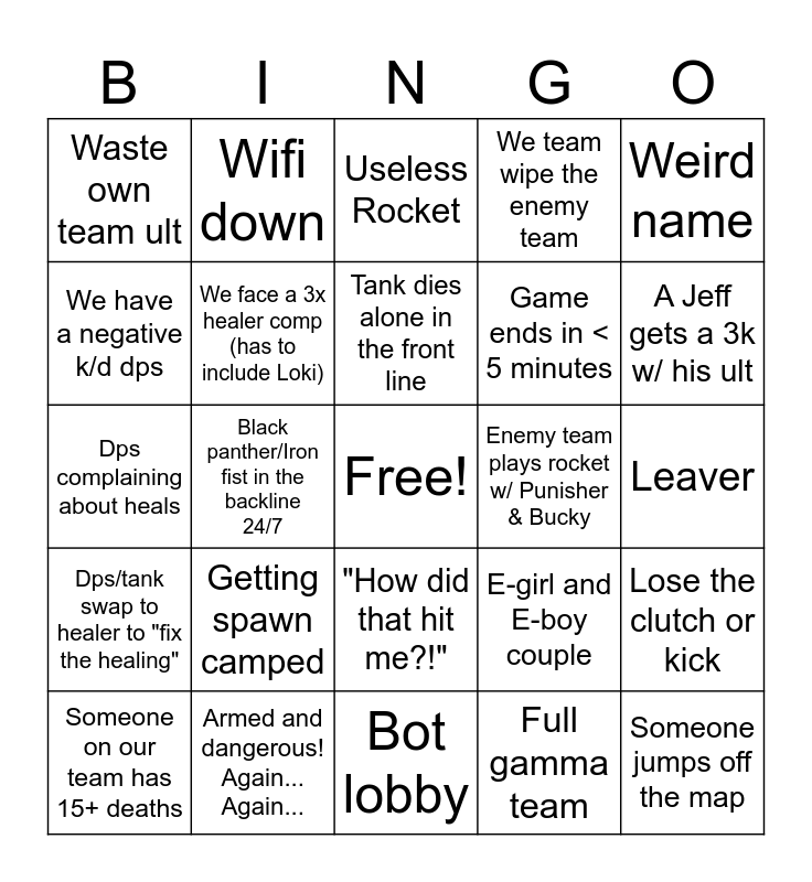 This bingo card has a free space and 58 words: Cancel enemy team ult, Armed and dangerous! Again... Again..., Our team has a negative k/d dps, Dps/tank swap to healer to "fix the healing", Full gamma team, Enemy team has a wolverine, We face a 3x healer comp (has to include Loki), Weird ban, Game ends in < 5 minutes, Our team gets a 4k, We team wipe the enemy team, Enemy takes point at 99%, 4 dps players, Single healer, Single tank, Waste own team ult, Someone jumps off the map, Weird name, Enemy team team wipes us, Tank dies alone in the front line, Enemy team plays rocket w/ Punisher & Bucky, Useless Rocket, Someone on our team has 15+ deaths, Lose the clutch or kick, Cart is pushed an entire point during OT, Leaver, Someone on our team wants to surrender, Dutch people recognize our names, A Jeff gets a 3k w/ his ult, Spawn- camping the enemy team, The Wheel chooses someone twice in a row, Game crashed, Enemy has negative k/d dps, Black widow in the game, Slurs in the chat/voice, Our tank ults without follow up, "Zoning ult", Black panther/Iron fist in the backline 24/7, Dps complaining about heals, Mind goblin, Getting spawn camped, Magneto ult does zero dmg, E-girl and E-boy couple, Bad strange TP, Getting a kill through a Luna/invis ult, "Press W", Not regrouping for three fights in a row, "How did that hit me?!", Bot lobby, Useless comms, "I like men", Random complaining, Peni mine in spawn, Rocket < 1000 dmg, Wifi down, NPC teammate, We have a negative k/d dps and Healer have more kills than dps.