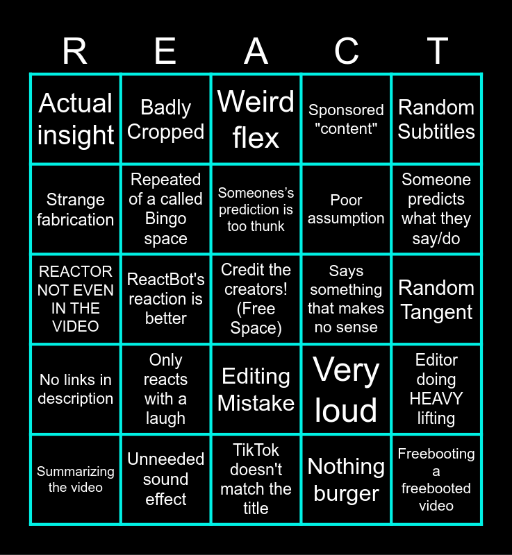 This bingo card has a free space and 45 words: Forgets to React, Freebooting a freebooted video, Shaky Cam, Summarizing the video, Stock meme clip inserted to carry, Nothing burger, Weird flex, Talking over the person in the video, Random Subtitles, Unneeded sound effect, Sponsored "content", Says something that makes no sense, Editing Mistake, Only reacts with a laugh, Cringe commentary, TikTok doesn't match the title, Weird inserted biases, REACTOR NOT EVEN IN THE VIDEO, Random graphic that adds nothing, Someone predicts what they say/do, Badly Cropped, Steals someone's joke, Over-dramatizing the TikTok, Actual insight, ...that was it?, Random Tangent, Just quotes the OG video, Bullies person in video, Very loud, No links in description, "This is me...", Editor doing HEAVY lifting, No credit onscreen, Replays the video, Bot Glazing in comments, ReactBot's reaction is better, Title referenced, Nonstop talking, “This guy”(creator vaguely referenced), Someones’s prediction is too thunk, Strange fabrication, Poor assumption, Omniscient, Repeated of a called Bingo space and ReactBot has a BAD take.
