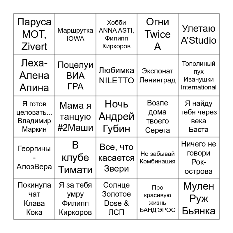 This bingo card has 35 words: Грею счастье Ёлка, Цветаева - Ваня Дмитриенко, Харизма Wallem, Экспонат Ленинград, Мулен Руж Бьянка, Паруса МОТ, Zivert, Поцелуи ВИА ГРА, Где прошла ты Кварц, Гио Пика, Возле дома твоего Серега, До рассвета Сати Казанова, Arsenium, Я готов целовать... Владимир Маркин, Маршрутка IOWA, Все, что касается Звери, Малинки Дискотека Авария, Жанна Фриске, Улетаю A’Studio, Георгины - АлоэВера, Я за тебя умру Филипп Киркоров, Хобби ANNA ASTI, Филипп Киркоров, Про красивую жизнь БАНД'ЭРОС, Я найду тебя через века Баста, Покинула чат Клава Кока, Мама я танцую #2Маши, Ночь Андрей Губин, Беги от меня Гости из будущего, Тополиный пух Иванушки International, Леха- Алена Апина, Город Сочи Сергей Трофимов, Солнце Золотое Dose & ЛСП, Не забывай Комбинация, Ничего не говори Рок-острова, Кобра Ислам Итляшев, В клубе Тимати, Любимка NILETTO, Огни Twice A and Шатенка TIGO.