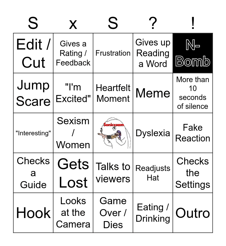 This bingo card has a free space and 24 words: Gets Lost, Looks at the Camera, Heartfelt Moment, Hook, N-Bomb, Edit / Cut, Jump Scare, Gives a Rating / Feedback, Dyslexia, Talks to viewers, Meme, "Interesting", Readjusts Hat, Checks the Settings, "I'm Excited", Eating / Drinking, Fake Reaction, Frustration, More than 10 seconds of silence, Sexism / Women, Outro, Checks a Guide, Gives up Reading a Word and Game Over / Dies.