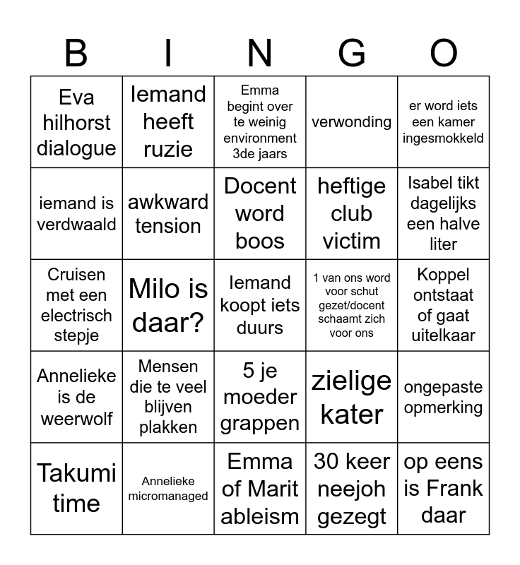 This bingo card has a free space and 38 words: Iemand word ziek, Iemand word berooft, 3de jaars drama, awkward tension, ongepaste opmerking, Mensen die te veel blijven plakken, Docent word boos, Mensen doen nog steeds moelijk over kamers, er word iets een kamer ingesmokkeld, heftige club victim, Milo is daar?, verwonding, op eens is Frank daar, Koppel ontstaat of gaat uitelkaar, iemand is verdwaald, Annelieke is de weerwolf, Jacorien maakt een onhandige opmerking, Emma begint over te weinig environment 3de jaars, Frank deelt wijsheid, 1 van ons word voor schut gezet/docent schaamt zich voor ons, Eva hilhorst dialogue, Annelieke micromanaged, Isabel tikt dagelijks een halve liter, Takumi time, Iemand word een aap genoemd in de dierentuin, Emma of Marit ableism, Kamer sleutel kwijt, dag 1 oordopjes, ''Eigenlijk ben ik heel gemeen'', Emma begint elke dag over cocktails drinken, ''God straft meteen'', 5 je moeder grappen, 30 keer neejoh gezegt, Iemand heeft ruzie, Iemand huilt, zielige kater, Cruisen met een electrisch stepje and Iemand heeft seks in het hostel.