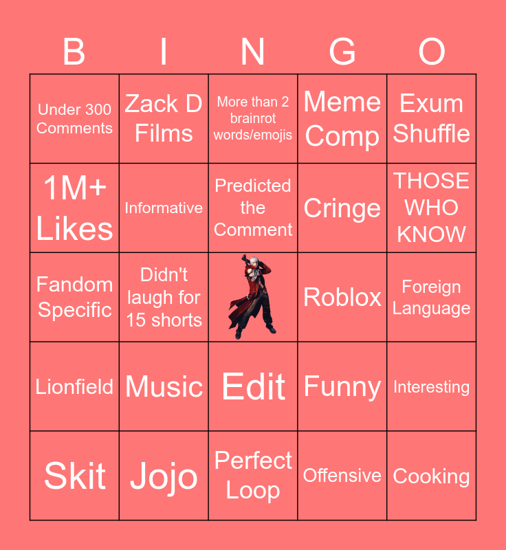 This bingo card has a free space and 24 words: Music, Jojo, Predicted the Comment, Skit, Exum Shuffle, Under 300 Comments, 1M+ Likes, Zack D Films, Roblox, Edit, Cringe, Fandom Specific, Funny, Interesting, Informative, Offensive, Foreign Language, More than 2 brainrot words/emojis, THOSE WHO KNOW, Didn't laugh for 15 shorts, Cooking, Lionfield, Meme Comp and Perfect Loop.