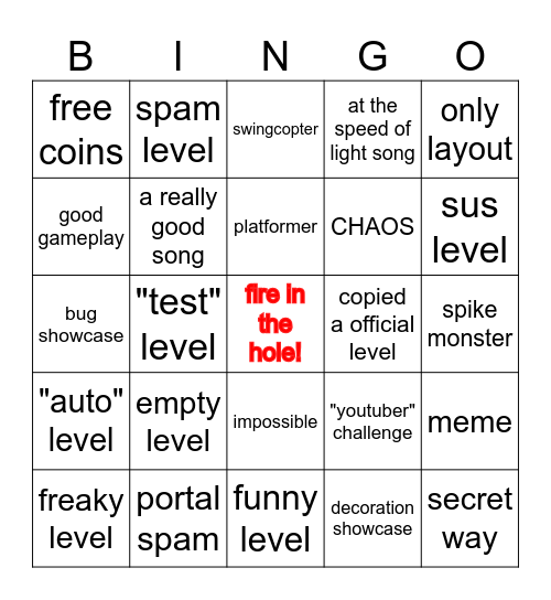 This bingo card has a free space and 24 words: empty level, portal spam, platformer, freaky level, only layout, free coins, good gameplay, spam level, copied a official level, impossible, CHAOS, bug showcase, "youtuber" challenge, meme, a really good song, decoration showcase, spike monster, swingcopter, sus level, "test" level, secret way, "auto" level, at the speed of light song and funny level.